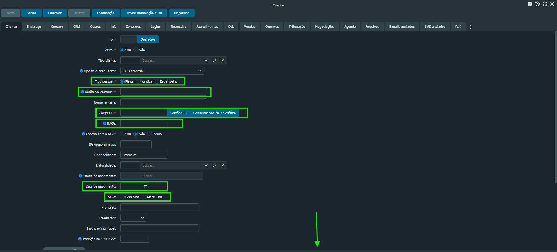 - Na aba Cliente. 1 - Escolha o tipo de cliente: (Pessoa Física ou Jurídica).