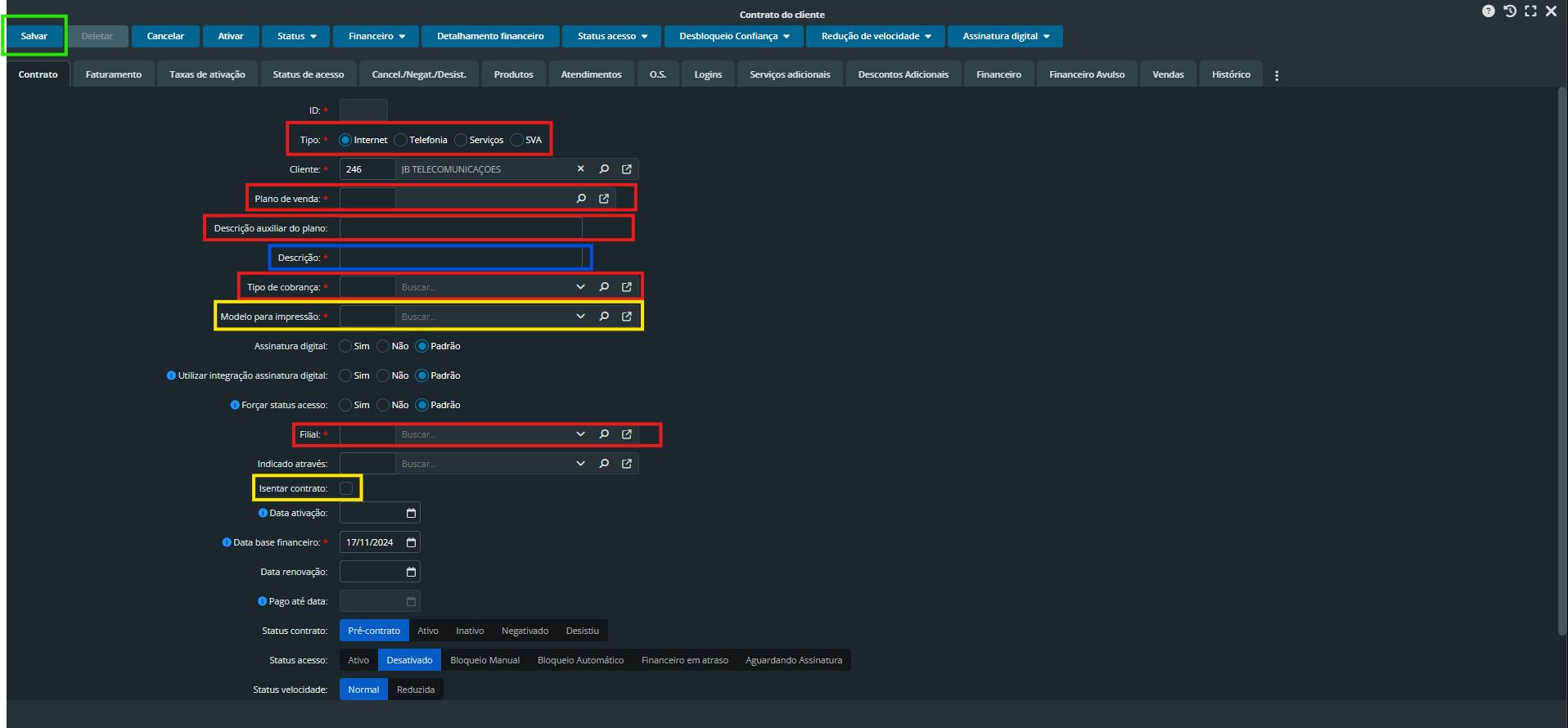 Obs.: O campo Isentar Contrato. Somente é utilizado para contratos isentos, quando é um cliente parceiro, ou quuando é feita a junção do valor deste contrato em outro.