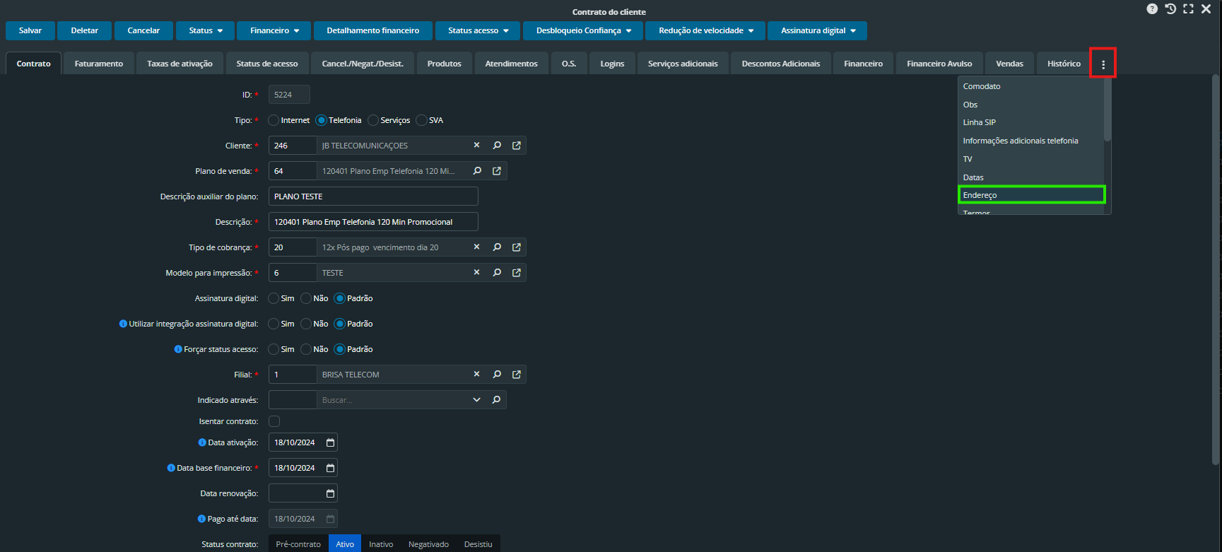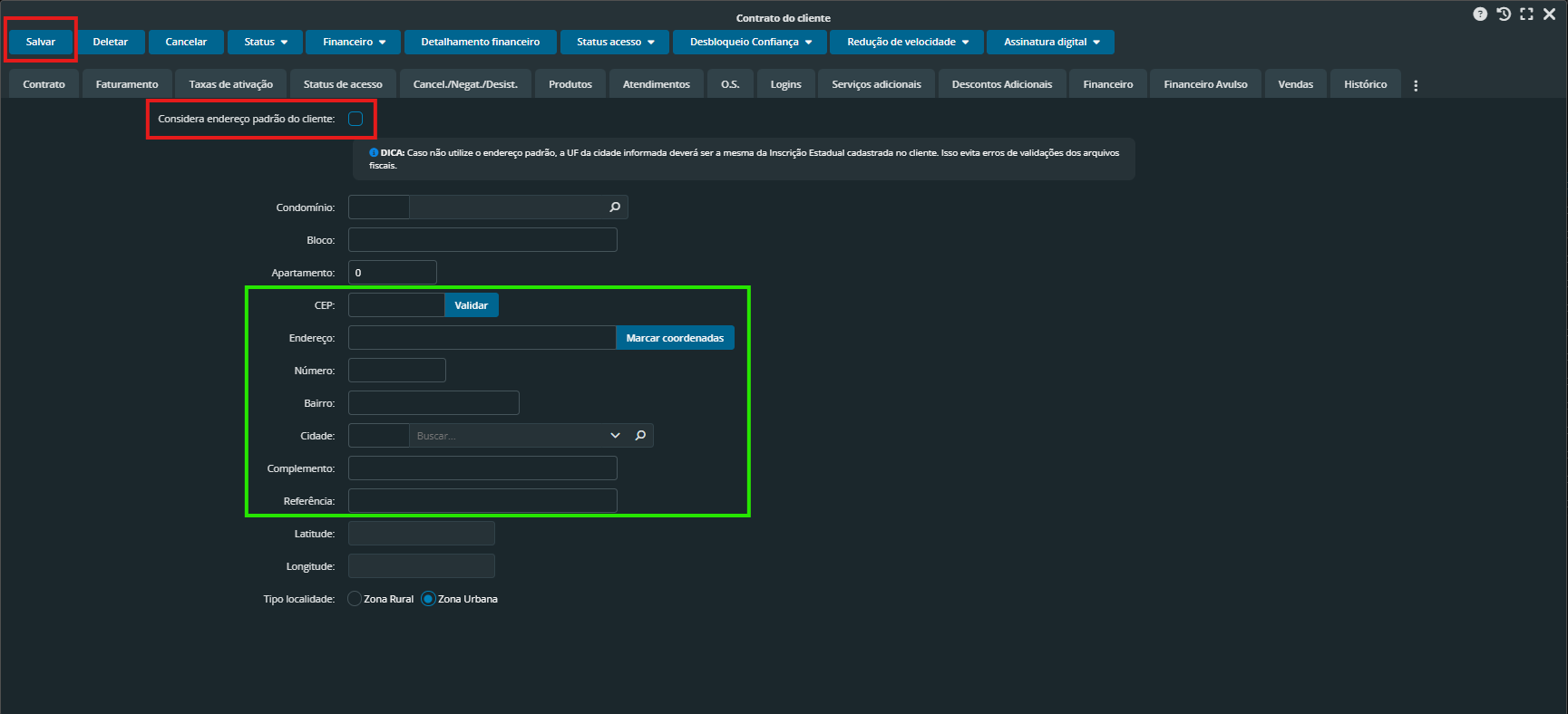 Caso o contrato seja de um Endereço diferente ao do cadastro do cliente, é necessário realizar a mudança do endereço, também no contrato.