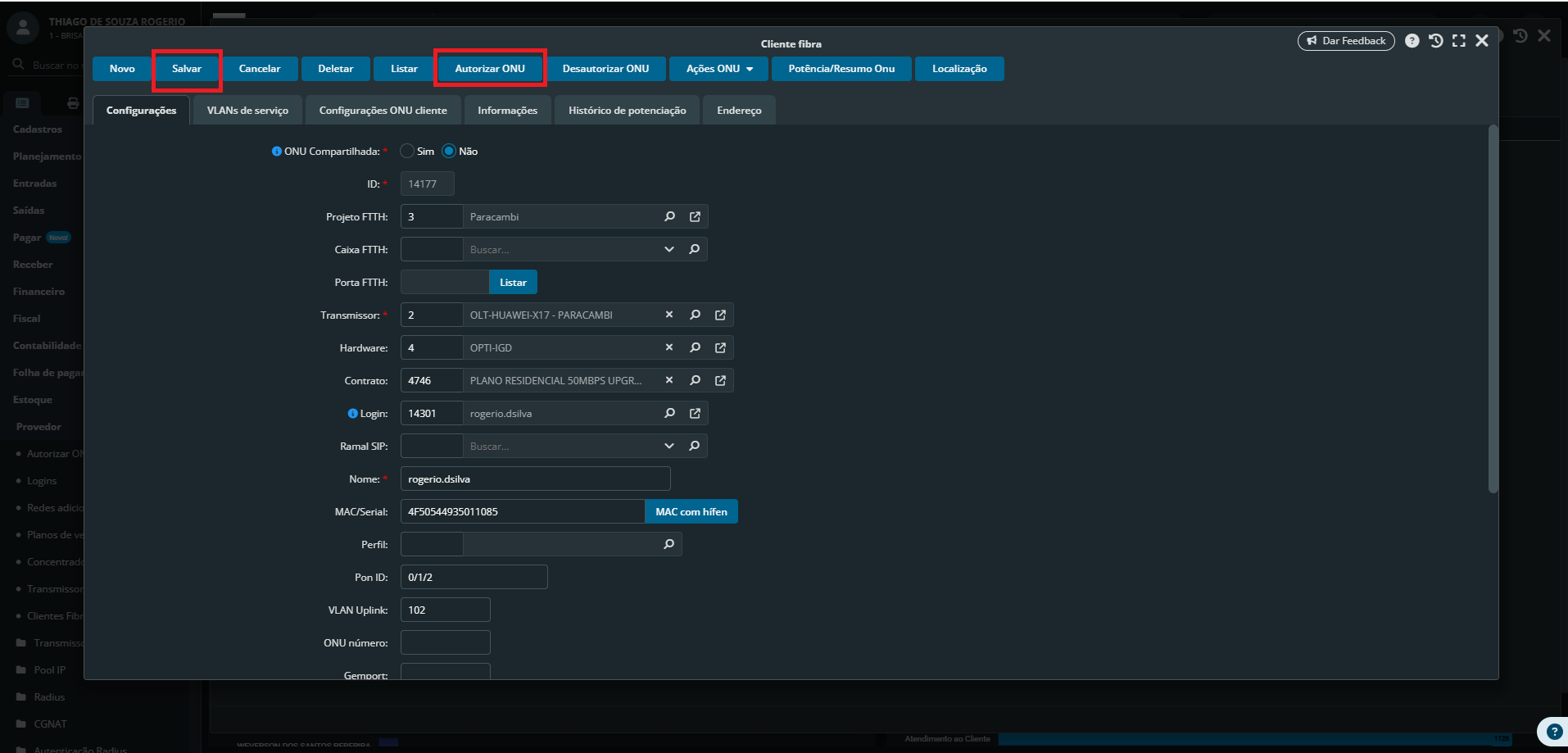 - No Menu Sistema no lado Esquerdo clique em Provedor > Autorizar ONUs.