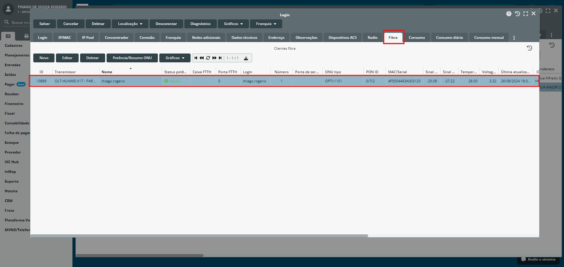 Vá na Opção Fibra e dê um duplo clique para que abra as opções da fibra. - Após abrir a Fibra.