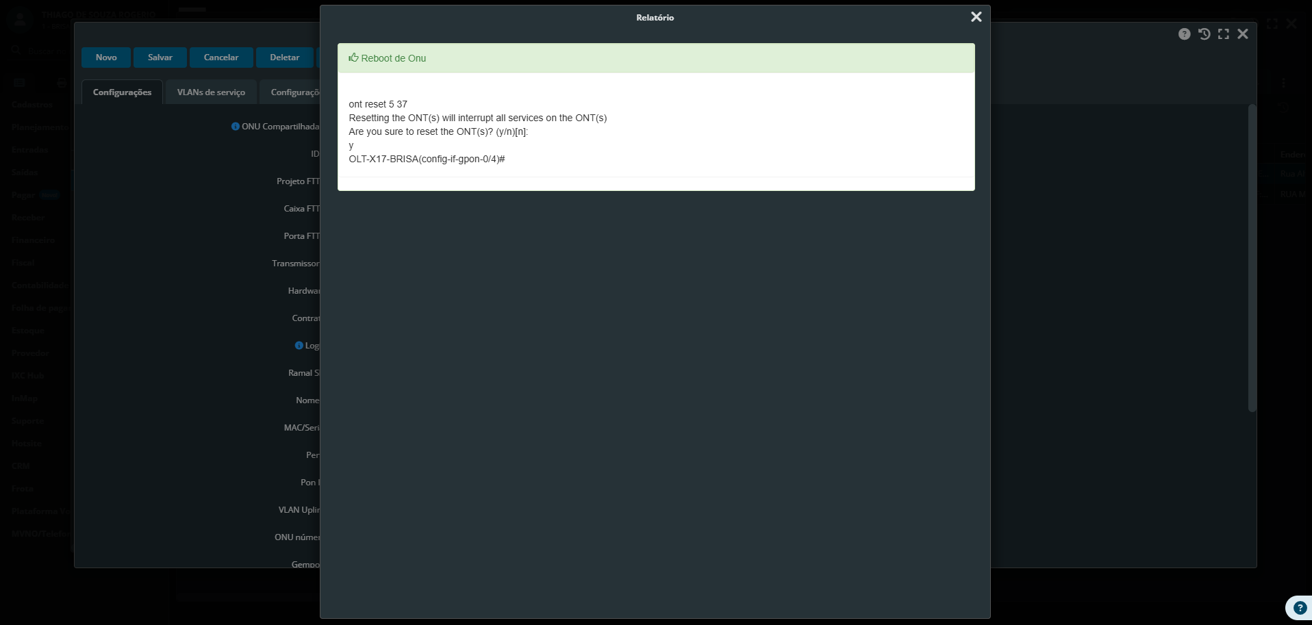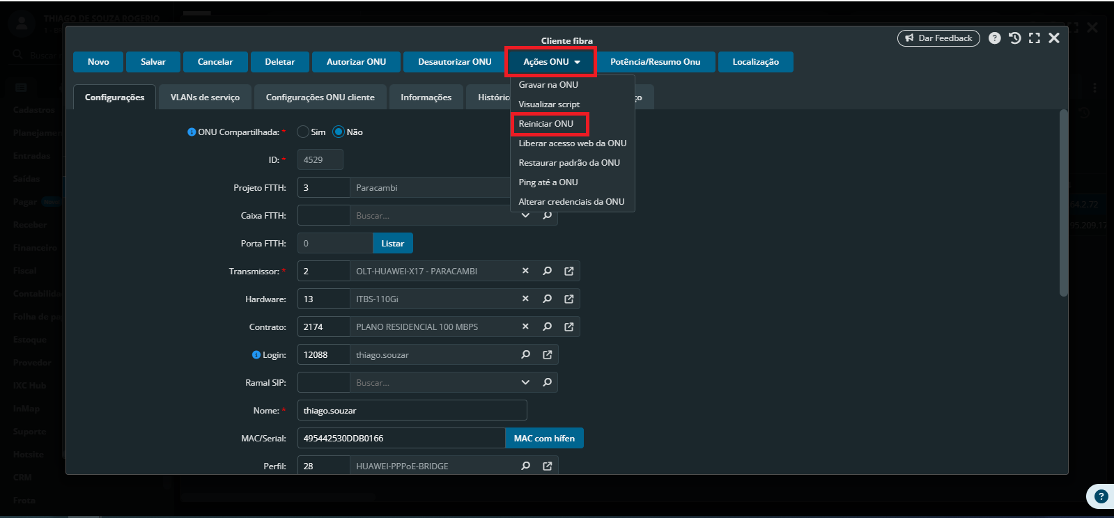 Vá na Opção Ações ONU e clique em Reiniciar ONU. - Logo em seguida o sistema irá realizar a confirmação que foi feito o reboot no equipamento.