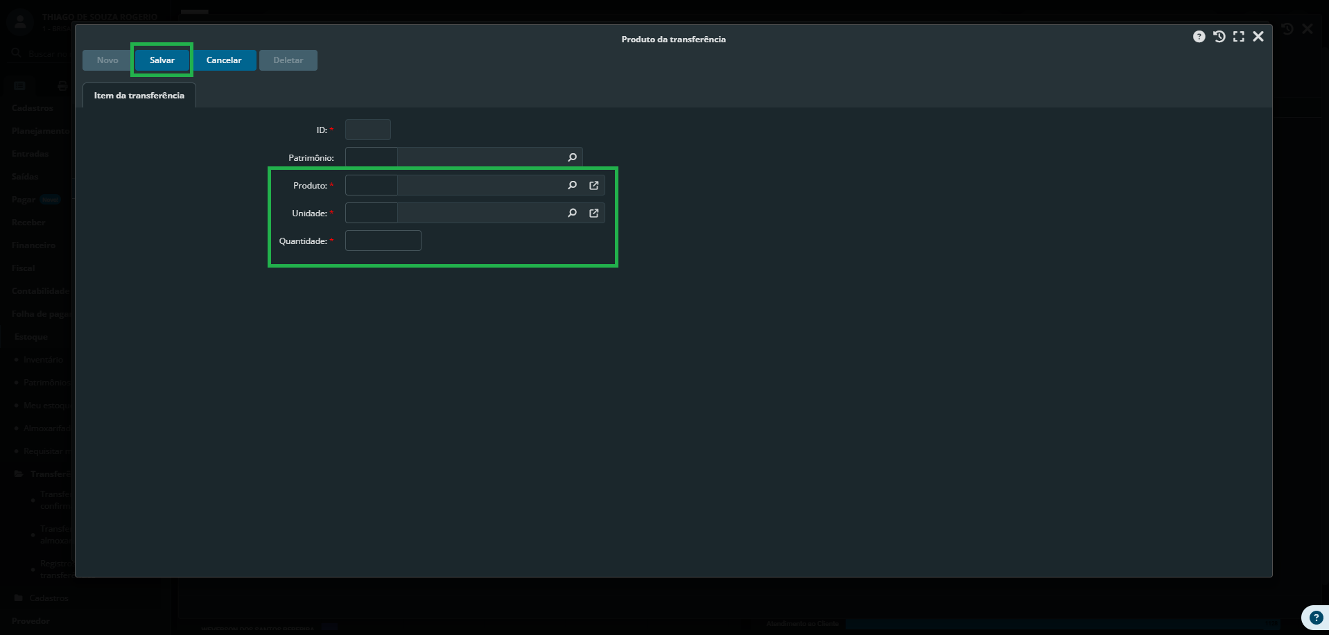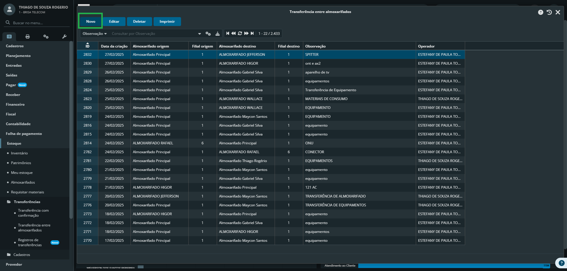 - Na janela Transferência entre almoxarifados clique em Novo.