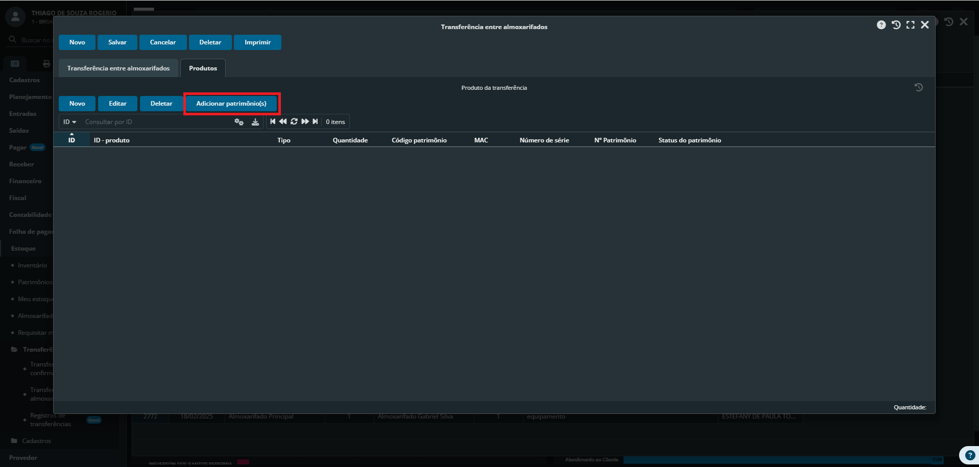 - Na aba de Produtos na janela Transferência entre almoxarifados.