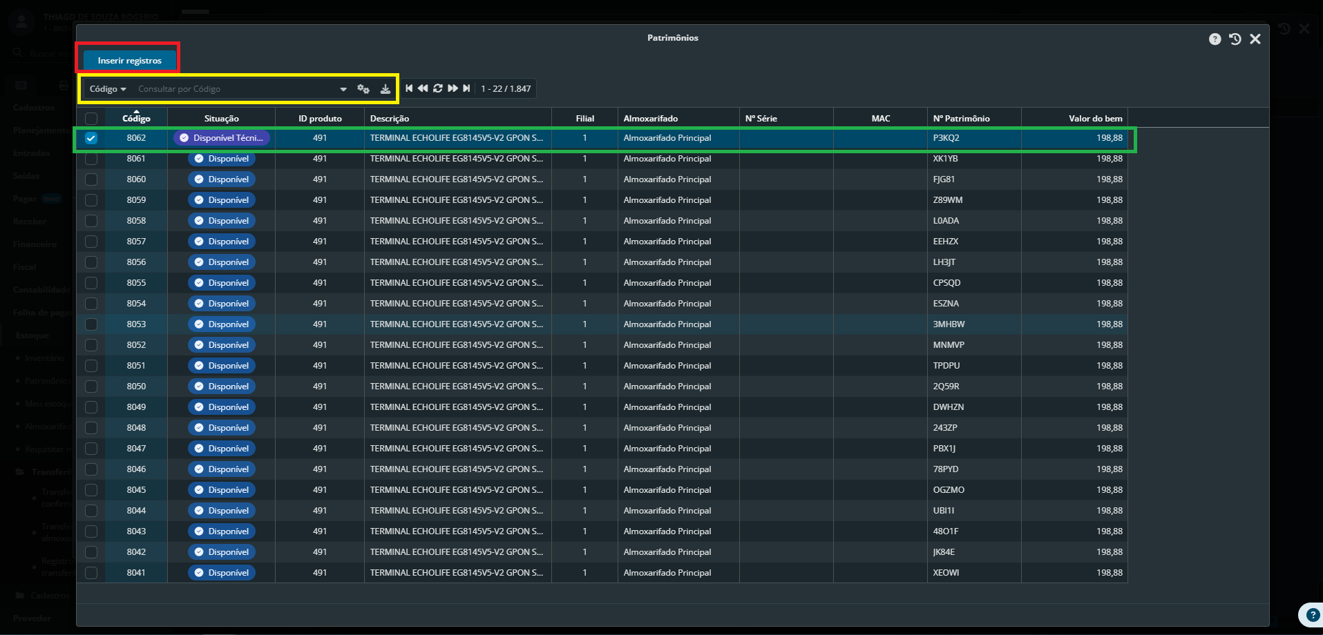 Obs.: Caso não tenha código de patrimônio, pode pesquisar pelo MAC ou Nº Série. Não esqueça de mudar o campo de pesquisa