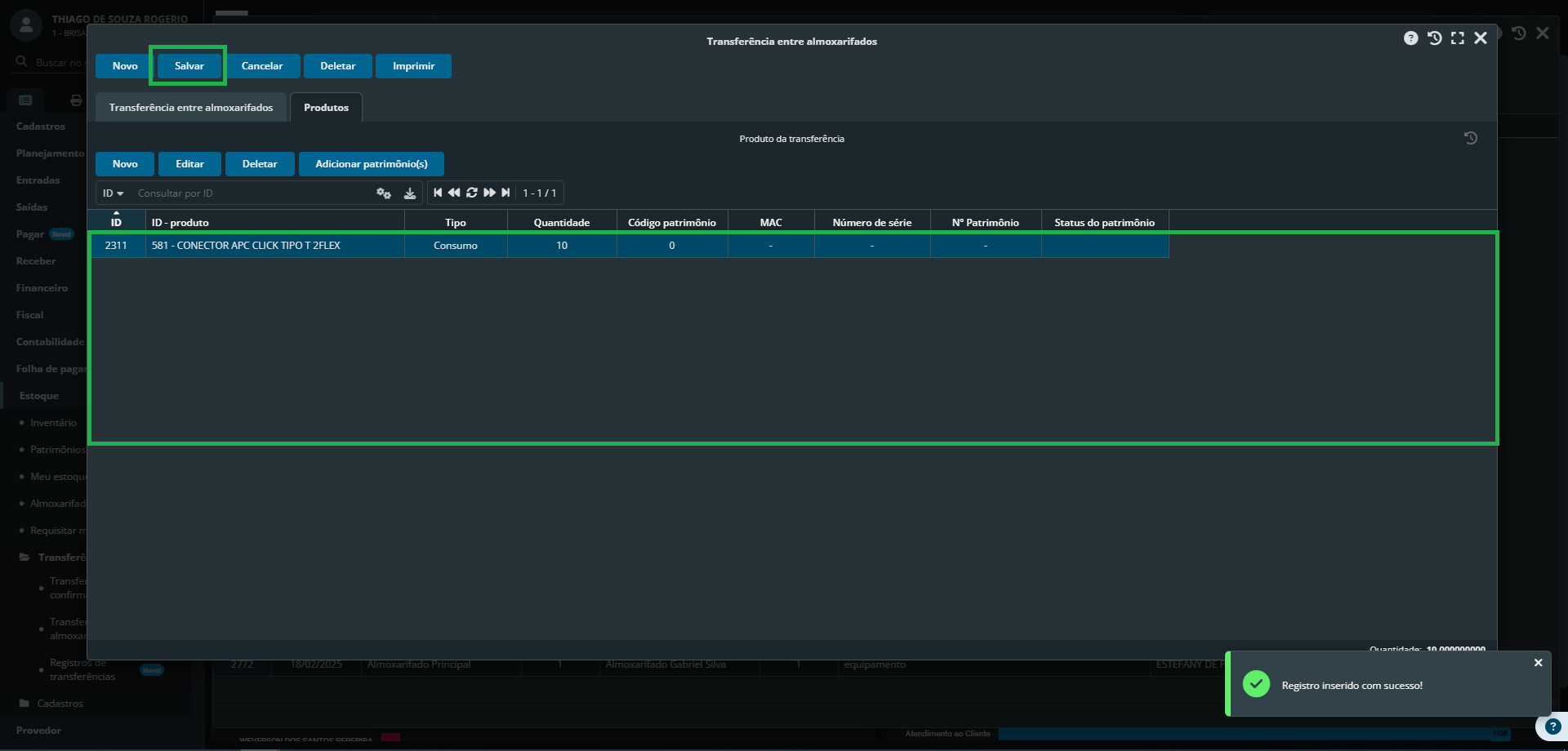 - Na aba de Transferência entre almoxarifados na janela de Transferência entre almoxarifados.